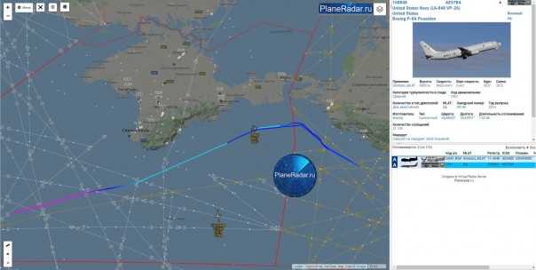 Противолодочный самолет Boeing P-8A Poseidon ВМС США во вторник провел разведывательный полет в районе Керченского пролива и Крымского полуострова. Об этом сообщает мониторинговый портал PlaneRadar в своем Twitter.