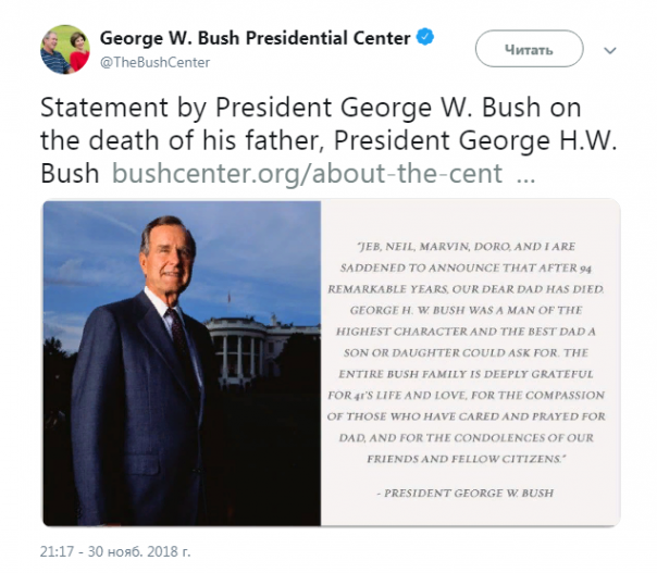 "Джен, Нейл, Марвин, Доро и я с прискорбью сообщаем, что, прожив 94 выдающихся года, скончался наш дорогой отец", — говорится в заявлении, опубликованном в официальном Twitter центра Буша-младшего.