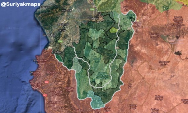 Зеленый: «Национальный фронт освобождения Сирии» (NLF) 3016 км2 (46,74%).