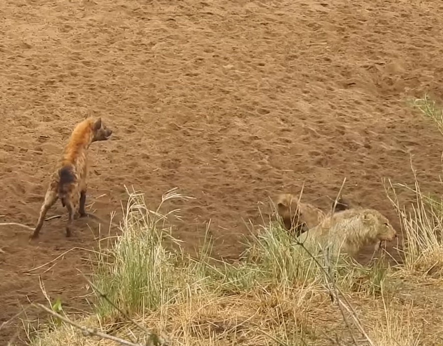 Однако на рык льва вскоре отозвались, и помощь не заставила себя ждать: камера захватывает приближающихся к месту сражения нескольких львиц. Развернувшаяся на глазах туристов картина напоминала известный эпизод из мультфильма «Король Лев» – так, сородичи пришли на помощь самцу и отогнали врагов. От внезапно появившихся королев саванны гиены удирали так резво, что подняли за собой тучи пыли.