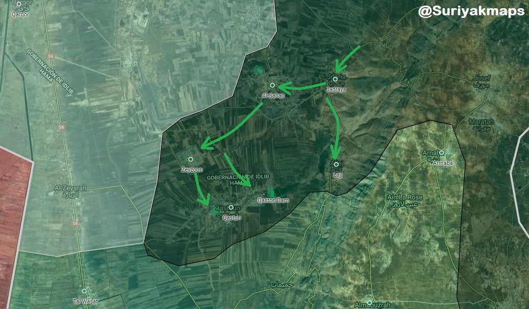 Согласно другим источникам произошли боестолкновения между группировками HTS* и «Ахрар аль-Шам» после того, как боевики «Ахрар аль-Шам» попытались открыть свою штаб-квартиру в поселке Ядрая (Jadraya), чему пытались восприпятствовать джихадисты HTS. Столкновения между группировками распространились от Ядраи до близлежащих поселков Анб (Anb), Зайзун (Zayzoun), Аль-Ладж (Al-Laj) и Телль-эль-Сахана (Tell al-Sahan), которые были захвачены HTS.