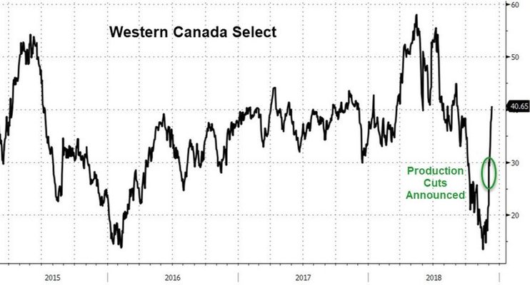 Но ситуация резко изменилась, и цена взлетела на 85%. Это произошло после того, как премьер-министр Альберты (где добывается основной объем нефти в Канаде) Рэйчел Нотли объявила о сокращении добычи нефти на 325 тыс. баррелей в сутки. Реакция рынка не заставила себя ждать.