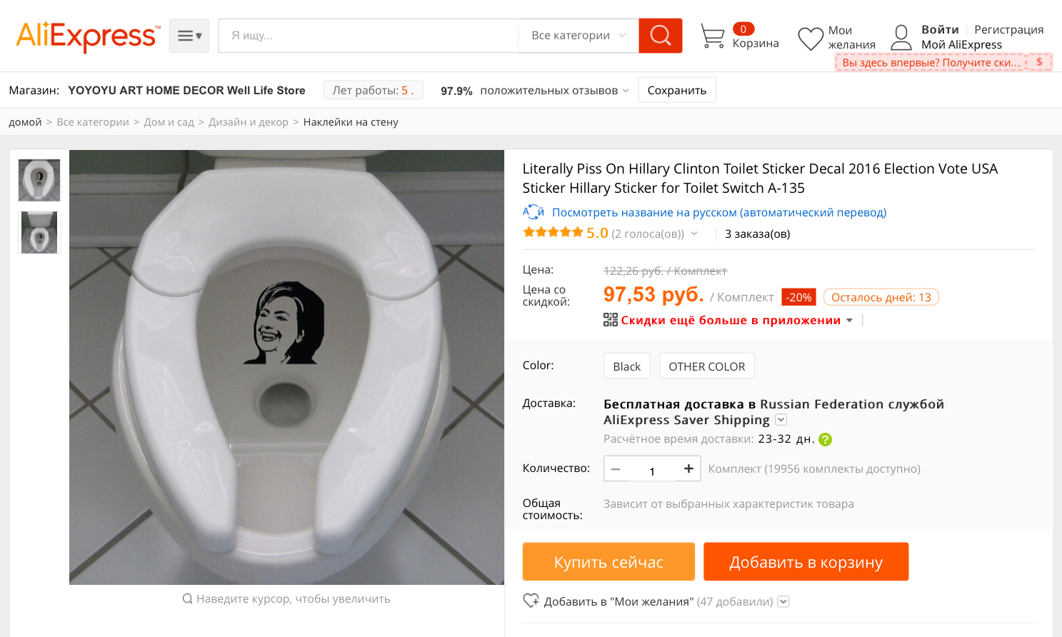 То, что в американских интернет-магазинах до сих пор можно купить стикеры, футболки и прочую продукцию с призывом сделать мокро г-же Клинтон - это, наверняка, тоже происки русских. Да)))