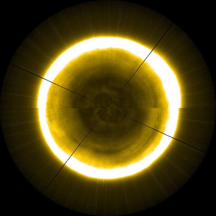 Атмосфера Солнца видна как характерный яркий ореол, окружающий солнечный диск. В центре воссозданного изображения можно увидеть темное пятно. Это корональная дыра, являющаяся источником высокоскоростного солнечного ветра.