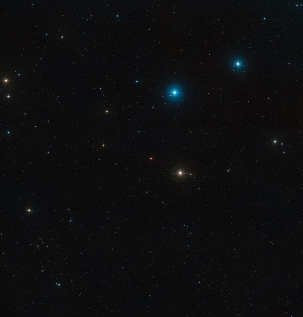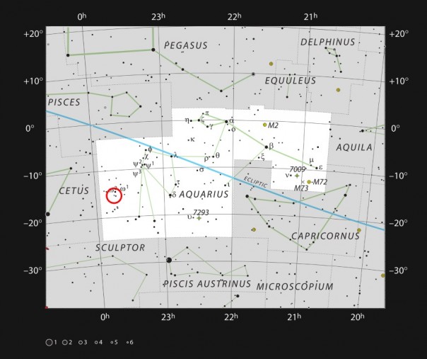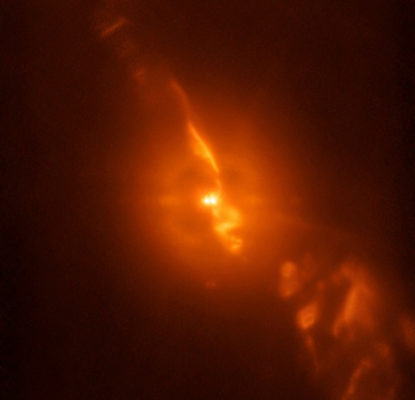 Звездная система R Водолея, расположенная на расстоянии около 700 световых лет Солнца. Она является ближайшей к нам симбиотической переменной, состоящей из холодного красного гиганта и горячего белого карлика.