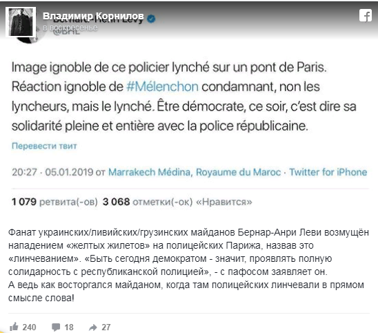 На своей странице в Facebook Корнилов написал: для него выглядит странно тот факт, что Бернар-Анри Леви возмущен нападением участников акции «желтых жилетов» на полицию. Владимир Корнилов удивляется: почему же тогда французский журналист, рьяно поддерживающий различные протесты и майданы (например, на Украине, в Грузии или в Ливии), не возмущался аналогичными нападениями на стражей правопорядка во время цветных революций.