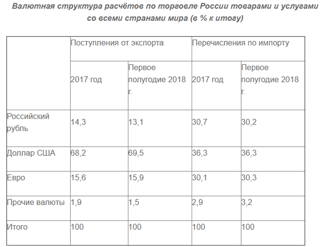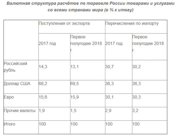 Второе место в расчётах занимает евро. Рубль оказывается лишь на третьем месте. Обратим внимание и на то, что в первом полугодии 2018 года доля доллара во внешнеторговых расчётах России не только не уменьшилась, но несколько подросла.