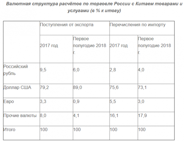В последние дни 2018 года как сенсация прозвучала новость о том, что Китай отказался подписывать межправительственное соглашение с Россией о расчётах в национальных валютах, которое готовилось с 2014 года. И, безусловно, сохранение высокой доли доллара США в расчётах по внешней торговле России и Китая будет серьёзным тормозом для дальнейшего наращивания взаимного товарооборота.