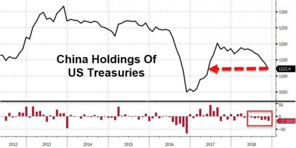 Так, например, Китай - крупнейший держатель этих бумаг - сократил вложения шестой месяц подряд - на $17,5 млрд до $1 трлн 121 млрд.