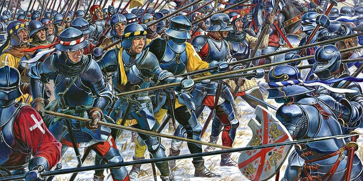 А «погибло» рыцарство после того, как появились устойчивые многочисленные пешие баталии, состоящие из алебардистов и пикинёров. Именно этот тип построения, активно применявшийся швейцарцами, а позже ландскнехтами, оказался не по зубам латной коннице и привёл к её упадку. Но на протяжении ещё целого столетия рыцари пытались меряться силой с тяжёлой пехотой, построенной в плотные «коробки».