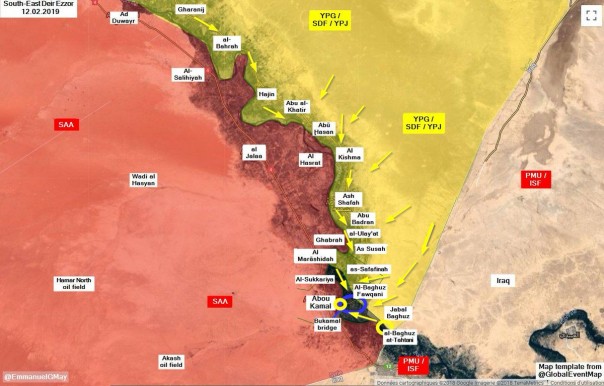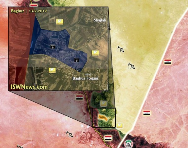 Силы арабо-курдского альянса SDF подходят к Багуз-Фукани с севера, это наступление пока остановлено командованием международной коалиции во главе с США, которая «намерена взять боевиков живьем». В результате авиаударов коалиции разрушена местная мечеть, медиа, близкие к боевикам, публикуют кадры столкновений со стороны ИГ*. Местные источники сообщают, что боевики используют население поселка в качестве «живых щитов». Видео