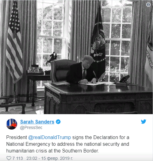 "Президент подписывает декларацию о национальном режиме ЧП для борьбы с кризисом с национальной безопасностью и гуманитарным кризисом на южной границе", - написала Сандерс.