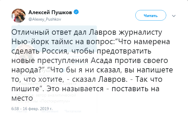 Глава МИД России Сергей Лавров с иронией ответил на вопрос корреспондента New York Times во время проведения 55-й Мюнхенской конференции по безопасности. Об этом в Twitter написал председатель комиссии Совета Федерации по информационной политике Алексей Пушков.
