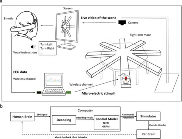 С помощью аппарата, регистрирующего электроэнцефалограмму (ЭЭГ) сигналы их мозга передавались на компьютер, что позволило создать алгоритмы по распознаванию паттернов активности – сигналов «лево», «право» или «вперед» (первые две команды успешно могут быть расшифрованы компьютером, а для того, чтобы направить крысу вперед, управляющие ими добровольцы моргали).