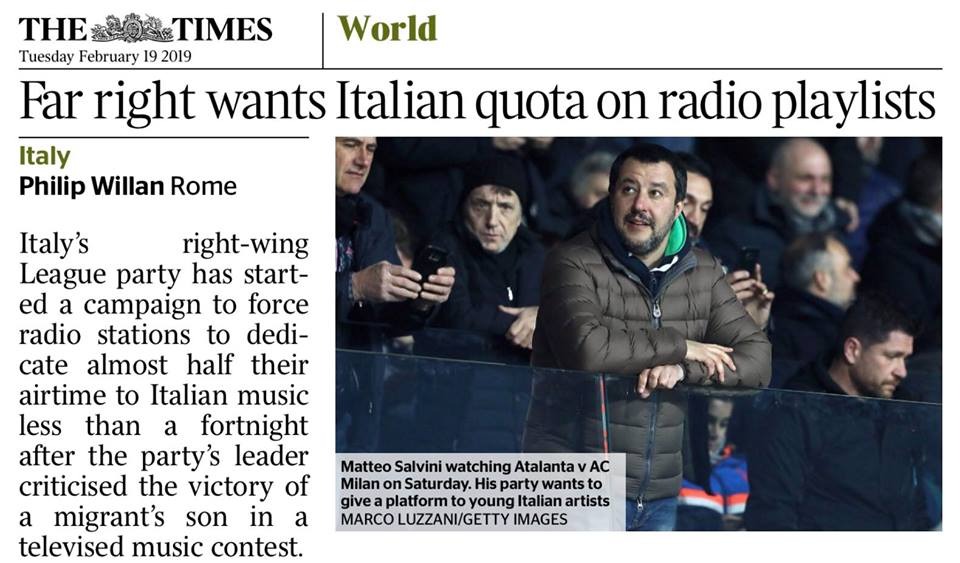 "Депутаты итальянской Лиги предложили ввести национальную квоту на песни для радио (хотят, чтобы обязательно на каждом канале крутили хотя бы часть музыкального продукта, произведённого в Италии). И тут же европейская пресса давай клеить на них ярлыки: «фашисты», «ультраправые», «подрывают европейские ценности» и т.д.