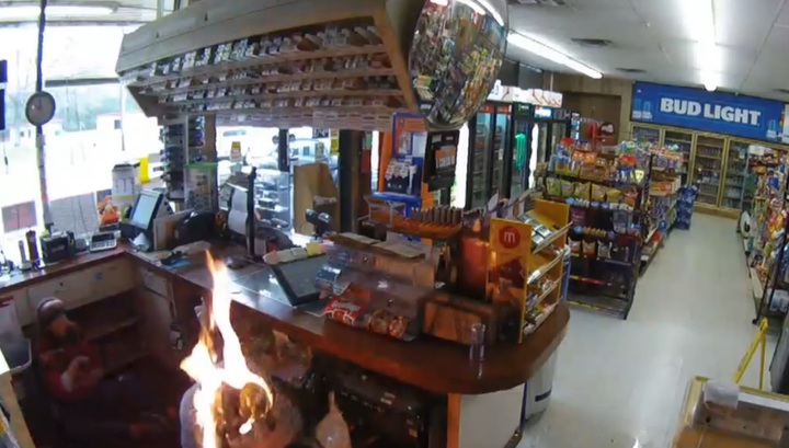 Преступник обмотал скотчем и поджег женщину во время ограбления заправки. Видео