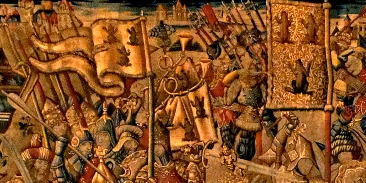 На мозаиках IX века в церкви св. Иоанна на Латеранском холме изображено, как Христос вручает Карлу Великому алое знамя империи с золотым крестом на древке. Описание этой хоругви сохранилось в «Песне о Роланде».
