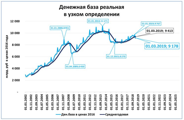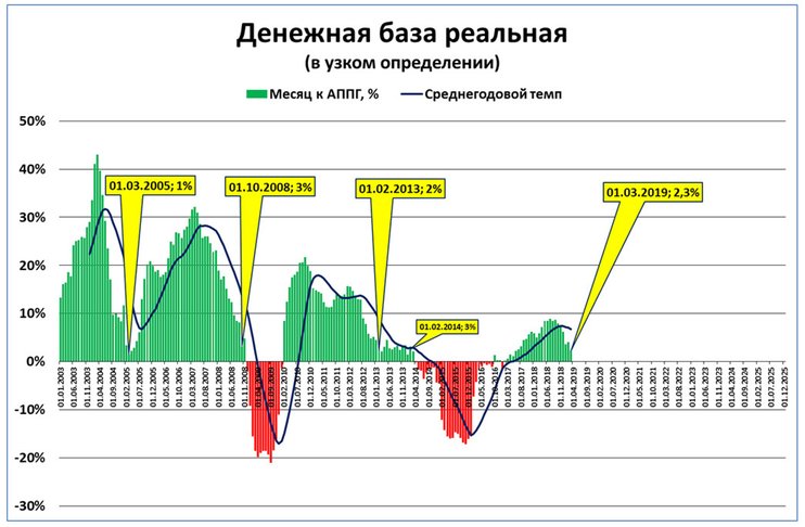 Если же резкого сжатия не будет, но низкие темпы роста реальной денежной базы будут держаться, как это было в 2013 г., на протяжении всего года, то резонно ожидать пусть не падения, но серьезного снижения темпов роста ВВП до уровня около 1%. И в конце 2019 г. мы можем услышать от наших властей то же, что слышали в конце 2013–начале 2014 гг. Вот, например, что говорил премьер Дмитрий Медведев в январе 2014 г.: "…Динамика нашего развития не может не вызывать озабоченности. Напомню, что если в 2010–2012 гг. средние ежеквартальные темпы роста ВВП составляли почти 4,5%, то во II и III кварталах прошлого, 2013-го, года только 1,2%, и это при том, что среднегодовые цены на нефть остаются вблизи своих исторических максимумов".