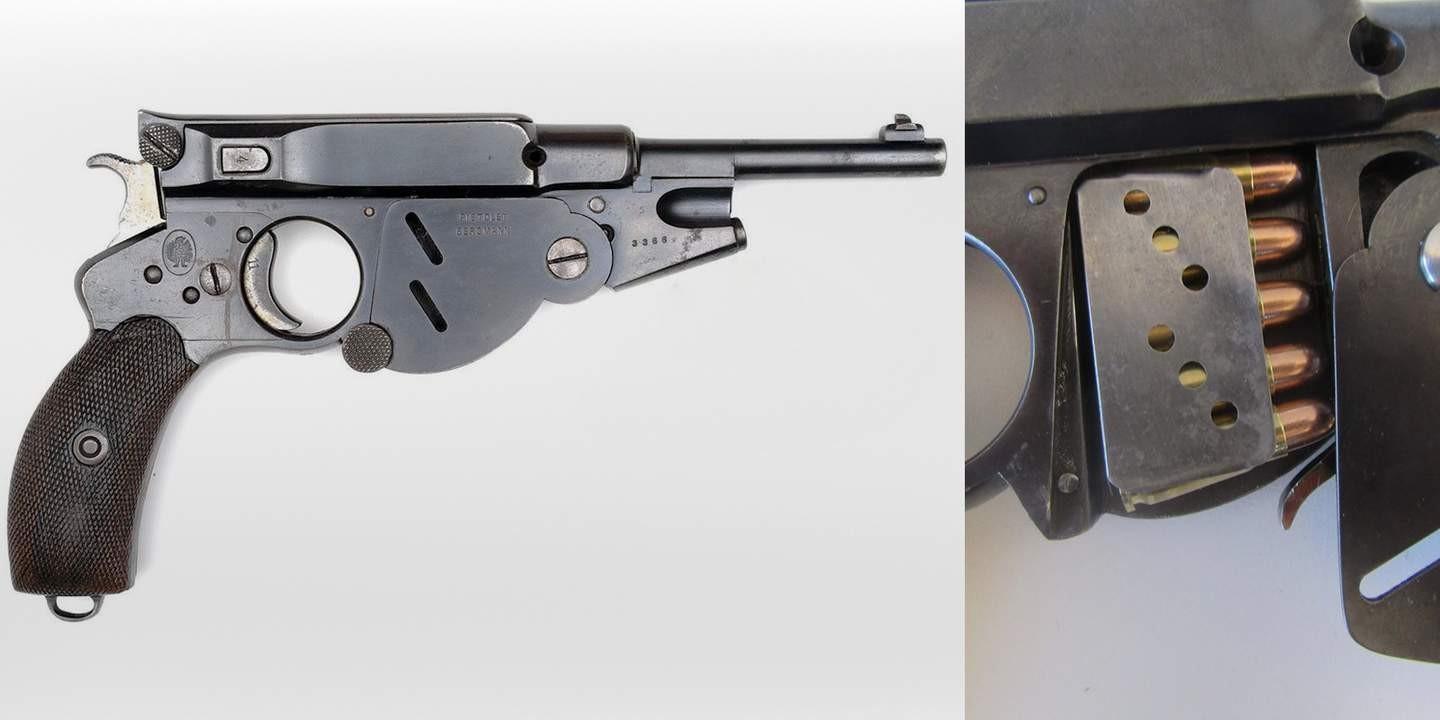 Самые первые пистолеты тоже иногда имели обойменное или пачечное заряжание неотъёмных магазинов. Из систем с обойменным заряжанием самые знаменитые — немецкий «маузер» системы 1896 года и австрийские «штайры» образцов 1905, 1907 и 1911 годов. Пачечное заряжание имели пистолеты Бергмана 1894 и 1896 годов.