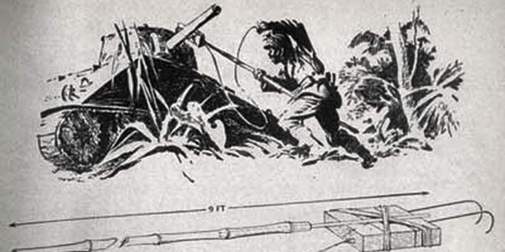 Чуть больше шансов имелось у охотников за танками с «удочками». На всё тот же бамбуковый шест крепился заряд взрывчатки, снабжённый двумя проволочными крюками. Ими следовало зацепиться за ствол орудия или пулемёта. Тем, кому бамбука пожалели, выдавали верёвочную версию.