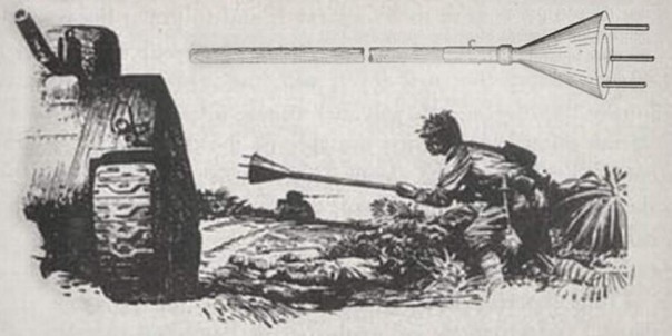 Ещё один вариант, по некоторым данным, представлял собой заряд цилиндрической формы на все том же бамбуковом шесте. Для закрепления на броне танка по бокам цилиндра имелось… две присоски.