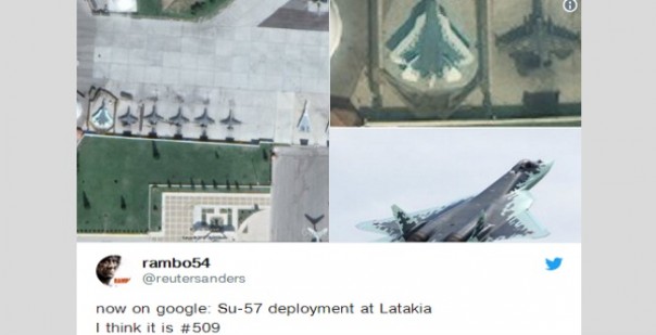 Между тем данную спутниковую фотографию легко найти в Интернете – на ней запечатлены самолеты, дислоцированные на авиабазе ВКС РФ более года назад – снимок был сделан 23 февраля 2018 года. На оригинальном снимке в точно том же порядке выстроены Су-57, окруженный стеной для защиты от возможного нападения, пять штурмовиков Су-25 и чуть подальше – два бомбардировщика Су-24. Упомянутый Су-57 с бортовым номером 509 – восьмой летный экземпляр, произведенный в 2017 году.