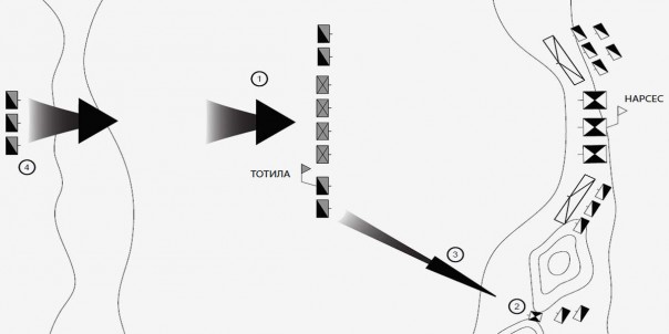 Вскоре армия Нарсеса встретилась с готами в решающей битве при Тагине (в Умбрии). Конные воины готского короля Тотилы атаковали центр византийского боевого порядка, состоявшего из тяжёлой пехоты и спешенной конницы.