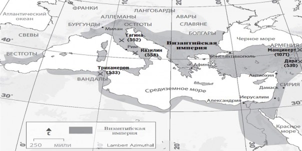 Империя Юстиниана. Карта из книги Б. Т. Кэрри «Дорога на Манцикерт: византийское и исламское военное искусство, 527–1071 гг.»