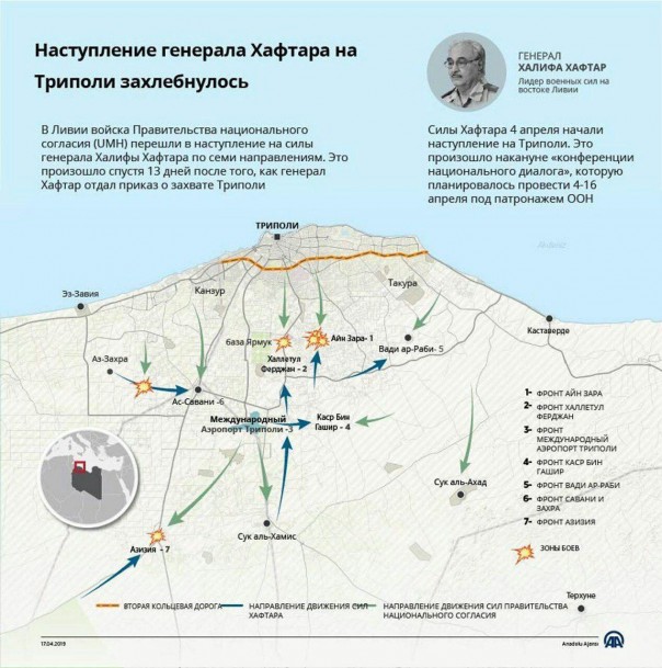 9.55. Турецкое ИА «Анадолу» оценивает наступление сил Ливийской Национальной армии LNA на Триполи как «захлебнувшееся». Силы главнокомандующего Халифы Хафтара вместо «блицкрига» увязли в позиционных боях, отмечают турецкие СМИ, а контратаки сил Правительства Национального согласия оказываются весьма болезненными.
