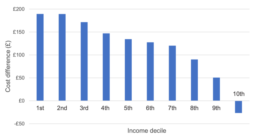 5. Естественно, это сокращение энергопайки происходит не равномерно - у бедных оно существенно быстрее, а у богатых и вовсе не сокращается, а лишь растет. Вот как это выглядит в разбивке по децилям дохода (сперва самые бедные 10%, потом следующие 10% и т.д.):