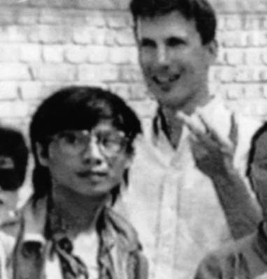 В нарушение указов о чрезвычайном положении, объявленном в части Пекина, Джон Е. Помфрет (John E. Pomfret), корреспондент AP в Пекине, вступал в частые контакты с главарями, передавая им информацию и предоставляя убежище. На снимке: Джон Е. Помфрет (в центре) и Ван Дань (первый слева) вместе.