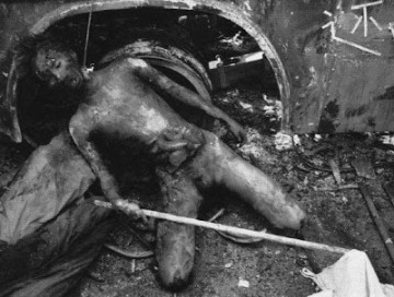 Ещё одно обугленное тело солдата. Обратите внимание на другого мертвого солдата, повешенного с эстакады.