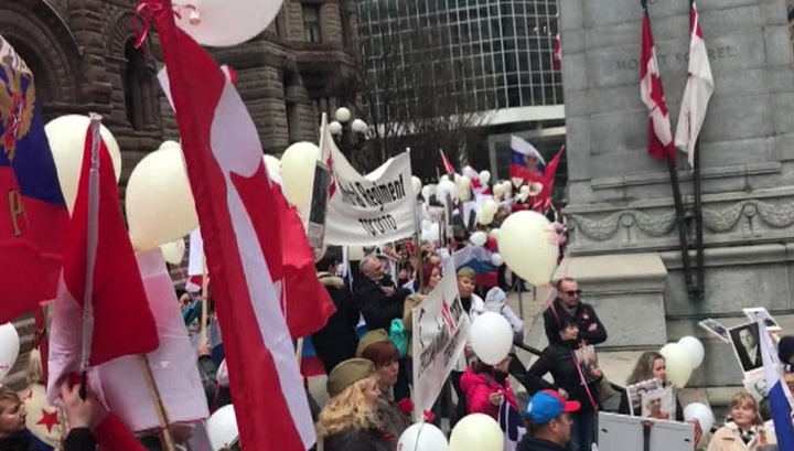 "Бессмертный полк" прошел и по Канаде. В Оттаве международная памятная акция собрала около 200 участников. Колонна под флагами Победы, Советского Союза и России отправилась от здания Национальной библиотеки к военному мемориалу и Могиле Неизвестного солдата. А в Торонто по центральным улицам города прошли пять тысяч участников "Бессмертного полка". У мемориала погибшим воинам они возложили цветы, а после почтили память минутой молчания. В акции приняли участие 10 ветеранов. Их, по словам организаторов, буквально завалили цветами и подарками.