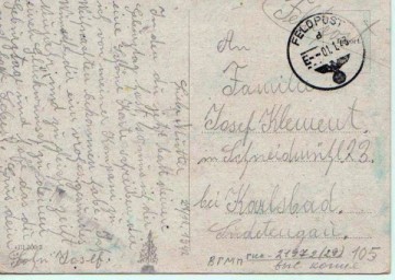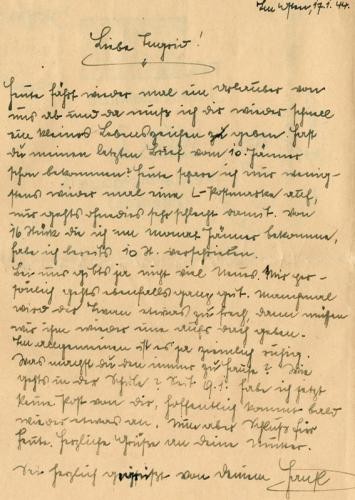 «Мой дорогой Ганс, сегодня я была счастлива получить снова от тебя письмо (...). Недельные обозрения хорошо показывают нам, какие они там ужасные, что с трудом можно их смотреть. Это прямо позор, что такой отвратительный сброд живет на этой земле, даже когда видишь Ужасные лица пленных, то становится противно от этих рож. Ну, довольно об этом (...). У меня сильный насморк и это не удивительно при такой погоде. Холодно, как осенью, а вам приходится там потеть. Твоя Гизель».