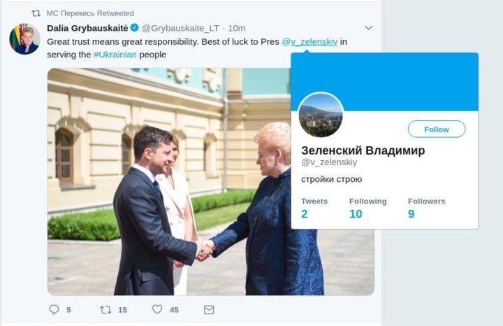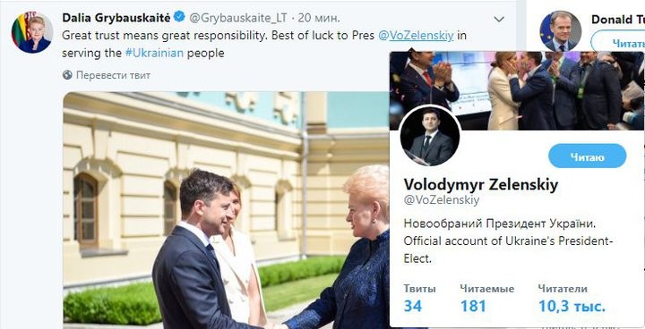 Сегодня глава Литовской Республики написала твит с поздравлением шестому президенту Украины: «Большое доверие означает большую ответственность. Удачи президенту @V_Zelenskiy в служении украинскому народу».