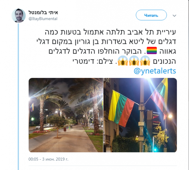 "Упс: муниципалитет Тель-Авива повесил вчера по ошибке флаги Литвы, а не флаги гордости", - говорится в сообщении в Twitter Itay Blumental.