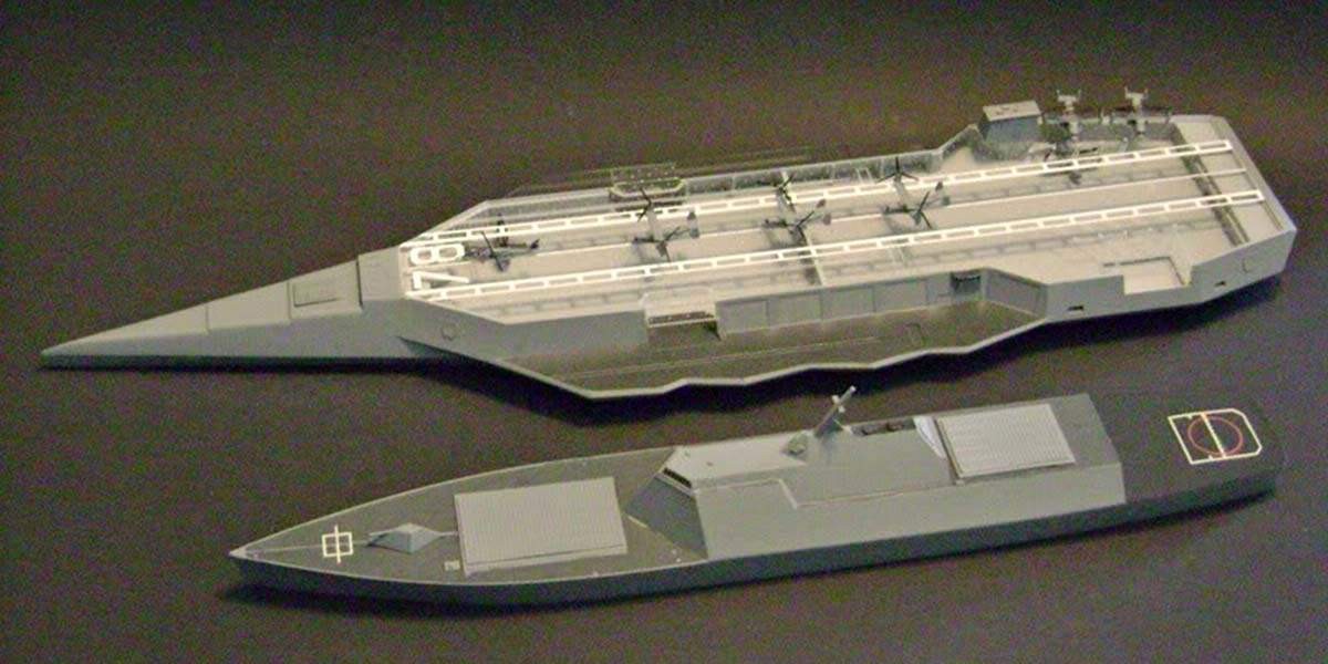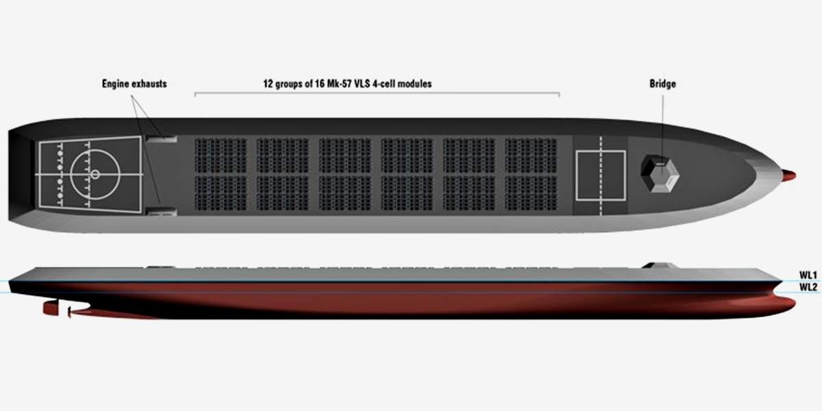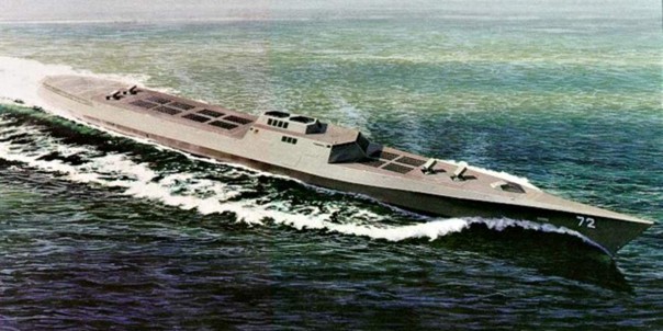 Другая концепция вообще предполагала создание не полноценного корабля, а чего-то вроде роботизированной баржи с ракетами, в обычном состоянии буксируемой теми же эсминцами. В случае необходимости такая баржа могла бы даже недолго идти сама, в автоматическом режиме, но для самостоятельных океанских плаваний приспособлена не была.