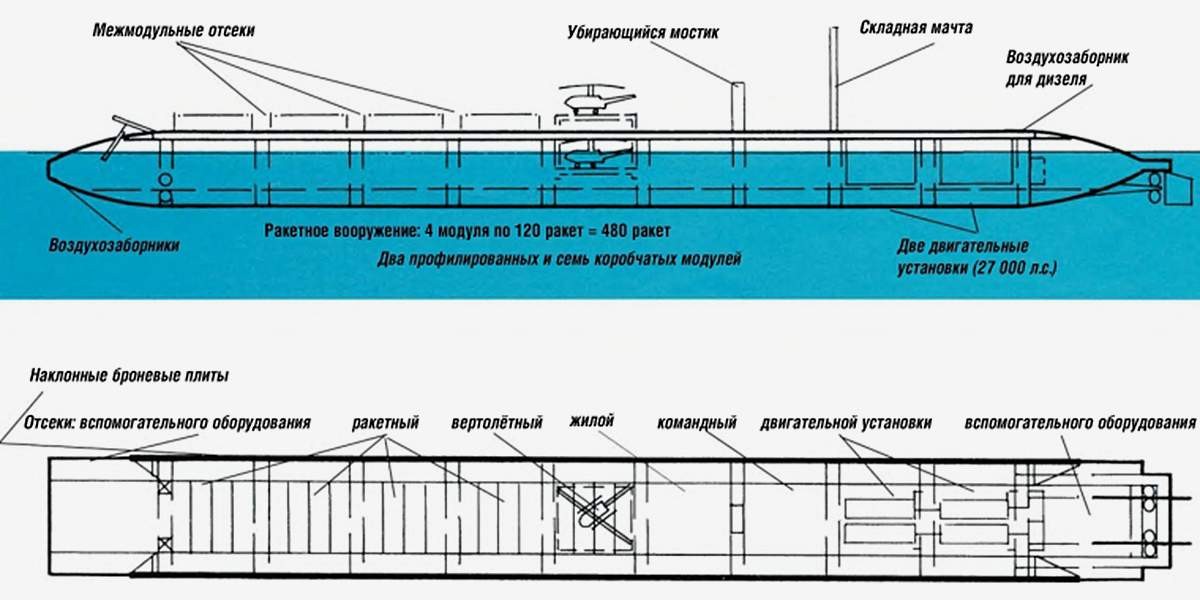 Кроме того, в связи с кораблём-арсеналом всплыла столь милая любому высокопоставленному военному концепция модульности. Почти всё полезное пространство арсенала занимали универсальные ячейки, в которые устанавливались пусковые для различных ракет. Но вместо ракетного блока вполне можно было поставить и что-то другое.