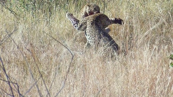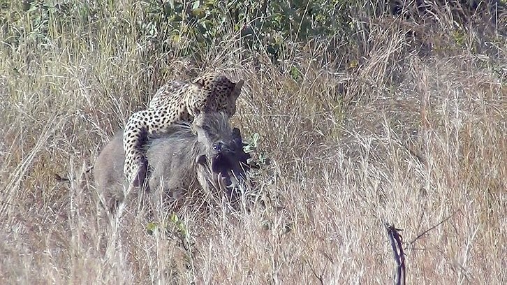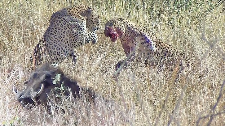 Гид предположила вслух, что громкий визг жертвы привлечет внимание других хищников – и оказалась права! Вскоре рядом появился второй леопард. Кошки начали бороться за добычу, и освободившийся бородавочник не преминул скрыться. Симпатии зрителей остались на его стороне, несмотря на то, что леопард лишился добычи. Источник