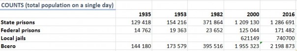 3) Теперь о США. Проблема та же, что и со статистикой по СССР. И опять хвалю Росстат- спасибо, что свели все нынешние виды учреждений (СИЗО, тюрьмы, колонии) в одну таблицу. По США, как я понял, три основных вида учреждений- State prisons (тюрьмы штатов), Federal prisons (федеральные тюрьмы), Local jails (понял из определений, нечто похожее на СИЗО, учреждения под юрисдикцией местных администрацийкак "для содержания лиц ожидающих суда или совершивших незначительные преступления). Так вот на сайтах государственных ведомств натыкался на цифры по штатовским и федеральным тюрьмам (включая совсем свежие данные). Но вот источник где бы в одной таблице были одновременно даны все три вида учреждений (чтоб сравнивать с российскими можно было) нашел на сайте Prison Policy Initiative. Это общественная организация, но в пояснениях к таблицам указаны источником данных именно официальные государственные ведомства, так что цифраам можно доверять. Просто на данном сайте государственные цифры удобно совмещены. Правда данные заканчиваются 2016 годом, но повторюсь, зато полные. Предлагаю пройти по ссылке- там содержится гигантская таблица с данными начиная с 1925 года. Я сюда размещу только "огрызок". Оставил годы когда у нас заканчивали Сталин и Брежнев, начинал Путин.