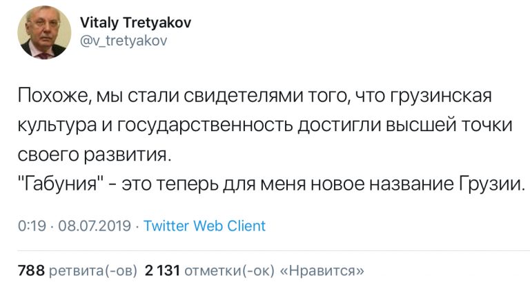 Что касается глупости, то г-н (не путать, помните с кем, да?) Габуния, не обладая большим умом и не просчитав последствия, поддался греху соблазна стать новым символом свободной и независимой (от здравого смысла) «прекрасной Грузии будущего». Грузии без Путина, без «оккупантов» и их денег, без прибыли от экспорта вина. А ещё без уважения и какого-либо интереса к тому, «что там у грузин».
