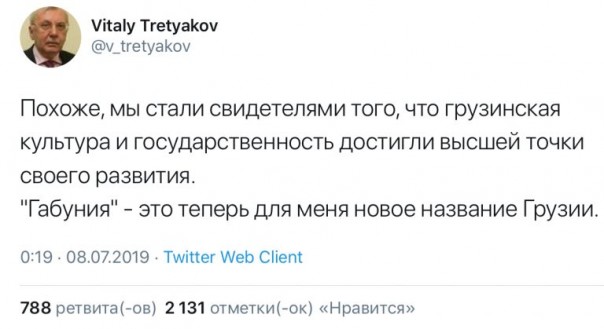 И если до вчерашнего дня в сознании нормального русского человека ещё существовала какая-то Грузия, то теперь, как метко заметил Виталий Третьяков, она стала для нас Габунией. И ей теперь с этим жить.