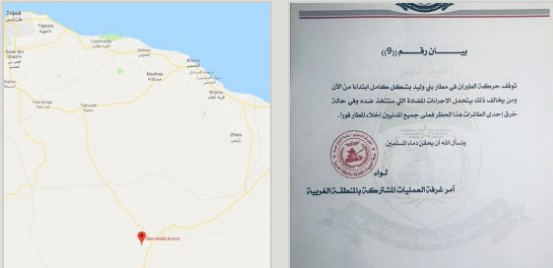 В Ливии командующий операцией «Вулкан гнева» (оборона Триполи силами Правительства Национального согласия GNA) дал приказ о прекращении воздушного движения через аэропорт Бани Валид. Против нарушителей будут приняты меры, также аэропорт должны покинуть все гражданские лица. Данный объект находится на границе подконтрольных GNA и Ливийской Национальной армии LNA территорий, вероятно, GNA готовится к действиям на данном направлении. Источник