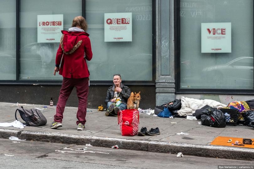 Район буквально зассан и засран. Город установил пять переносных кабинок для бездомных, но этого мало. Народ продолжает мочиться и испражняться прямо на тротуарах. Как пишет New York Times, за последние 3 года город заменил около 300 фонарных столбов, разъеденных человечьей и собачьей мочой.