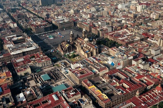 С высоты птичьего полета можно разглядеть руины древнего Теночтитлана – среди зеленых навесов над местом раскопок (внизу слева).