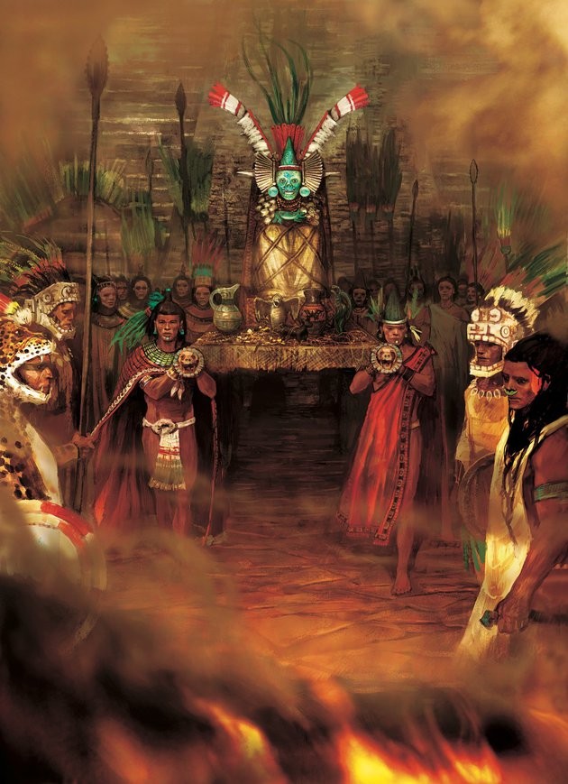 Искусность ацтеков ярче всего проявилась в сердце империи – Теночтитлане. Но этот великий город сохранил многие традиции и духовные практики, унаследованные от предшествующих цивилизаций. Ацтеков ошибочно представляют примитивным и кровожадным народом. Испанские конкистадоры сильно преувеличили число жертвоприношений, утверждая, к примеру, что во время одного лишь обряда освящения храма было умерщвлено 80400 человек. Такие жервы, будь они в самом деле, опустошили бы огромную часть Центральной Мексики. Некоторые, впрочем, склонны впадать в другую крайность и считать жертвоприношения выдумкой европейцев. Но и это далеко от истины.