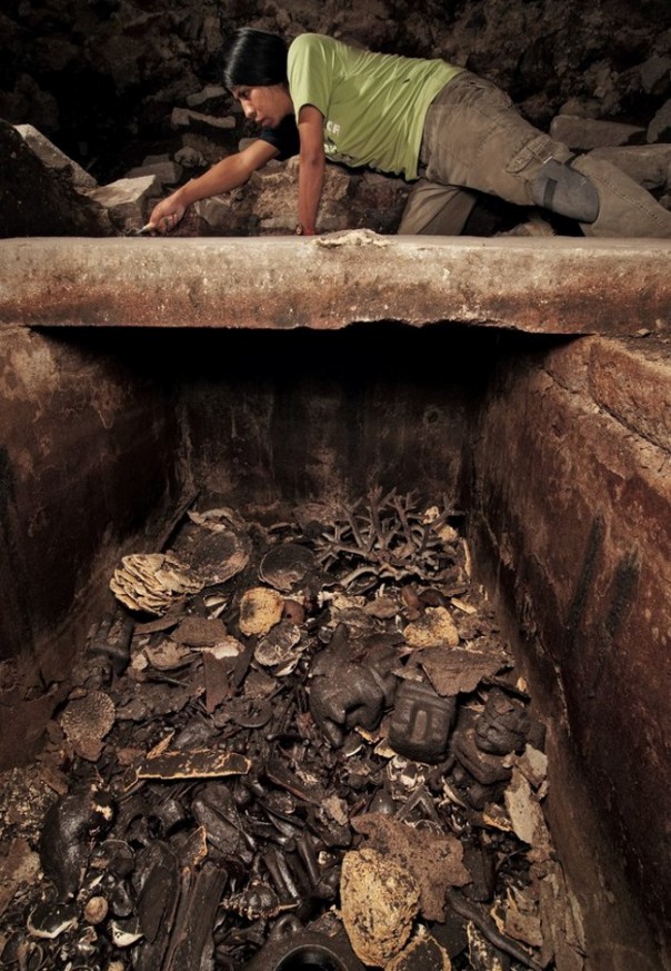 Вместе с археологом я стою на краю раскопа, где в мае 2007 года был обнаружен жертвенный ларец размером с небольшой чемодан. «Чтобы добраться до дна ларца, у нас ушло 15 месяцев. Внутри совсем мало места, но более пяти тысяч предметов разложены в десять слоев. Такую концентрацию и роскошь просто невозможно себе представить», – рассказывает Лопес Лухан. Каждая находка – большая радость для мексиканцев, ведь множество сокровищ конкистадоры вывезли в Испанию, откуда те разошлись по всей Европе.