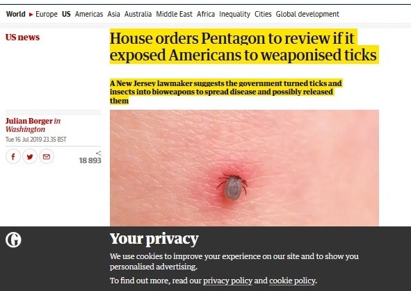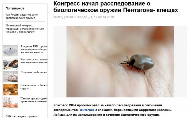 "Конгресс США проголосовал за начало расследования в отношении экспериментов Пентагона с клещами, переносящими боррелиоз (болезнь Лайма), для их использования в качестве биологического оружия. Об этом пишет Guardian. Некоторые политики в Палате представителей США серьезно убеждены в том, что Пентагон с 1950 по 1975 годы выпустил "на волю" клещей, впервые зараженных болезнью Лайма. Согласно петиции республиканца Кристофера Смита, министерство обороны могло тестировать клещей и других насекомых в качестве биологического оружия."