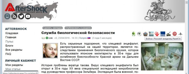Есть факты, убедительно доказывающие, что энцефалит клещевой - самое настоящее биологическое оружие, созданное японскими милитаристами в 30-40-е годы ХХ века - это адское достижение биолаборатории "Отряда 731", что располагался в Манчжурии. Об этом можно, например, прочитать в моей статье "Служба биологической безопасности" на сайте АШ