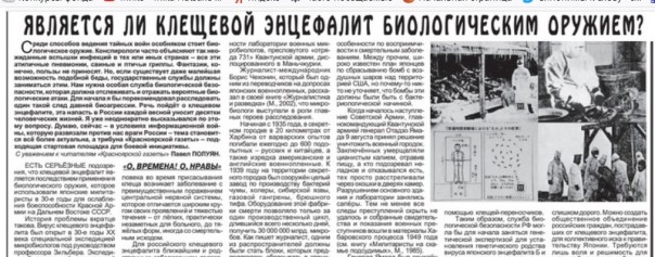 Меня такая озабоченность порадовала, поскольку уже много лет (первая публикация в 2003 году - https://www.pravda.ru/sport/40256-klesh/) я продвигаю идею общественного расследования о происхождении клещевого энцефалита.